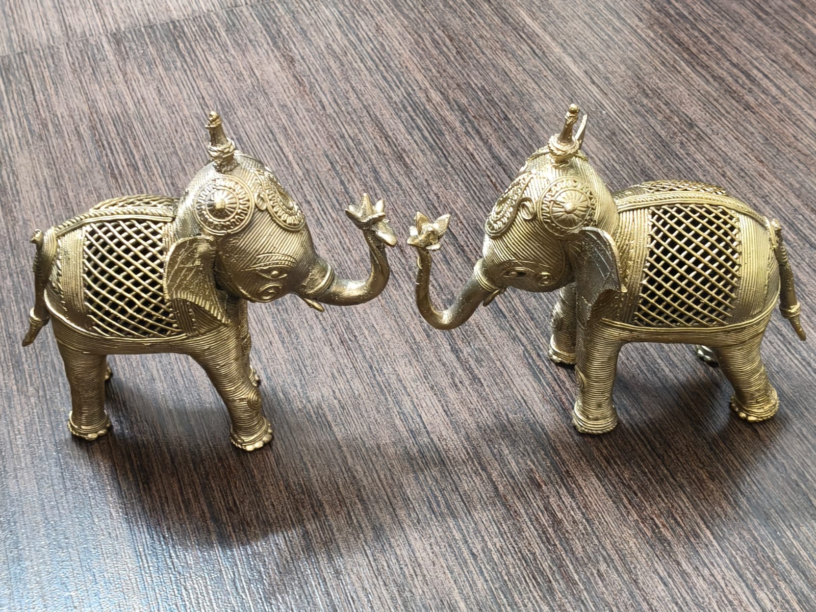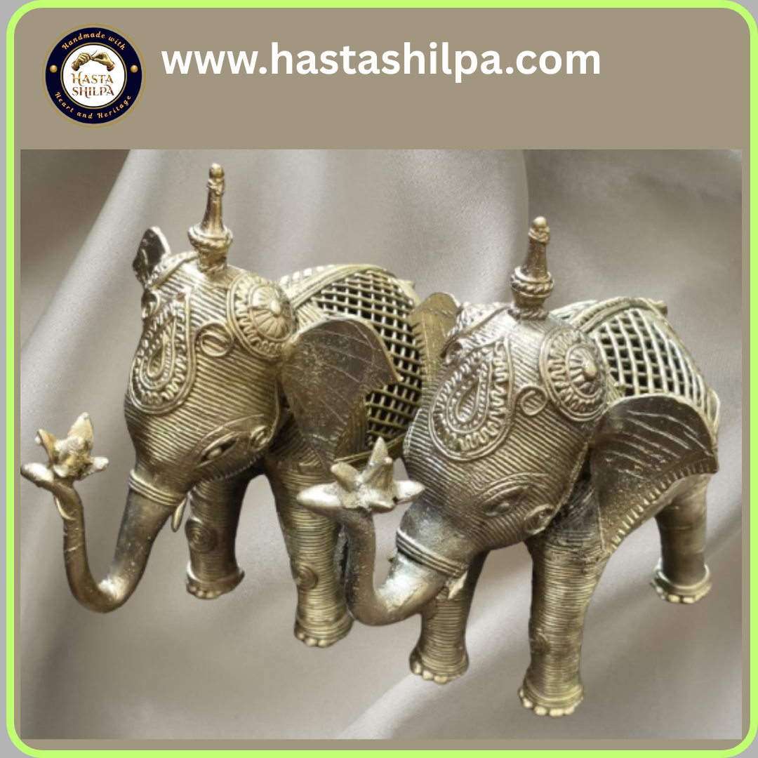 Grace your space with the Adorned Brass Large Elephant Duo, an exquisite pair of handcrafted elephants made in the ancient Dhokra art style. Together weighing 2.1 kg, these finely detailed elephants are adorned with traditional tribal motifs, reflecting the beauty of India’s timeless artistry.