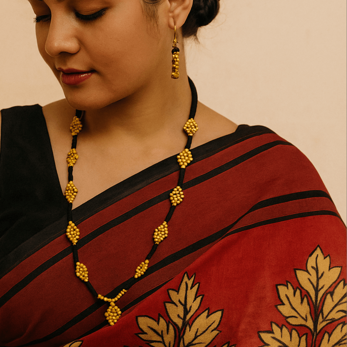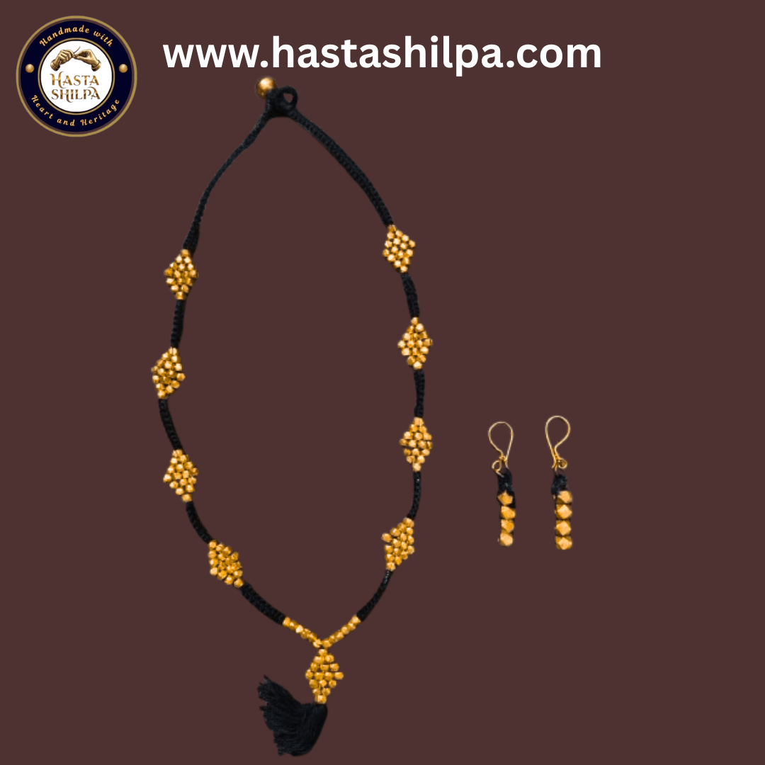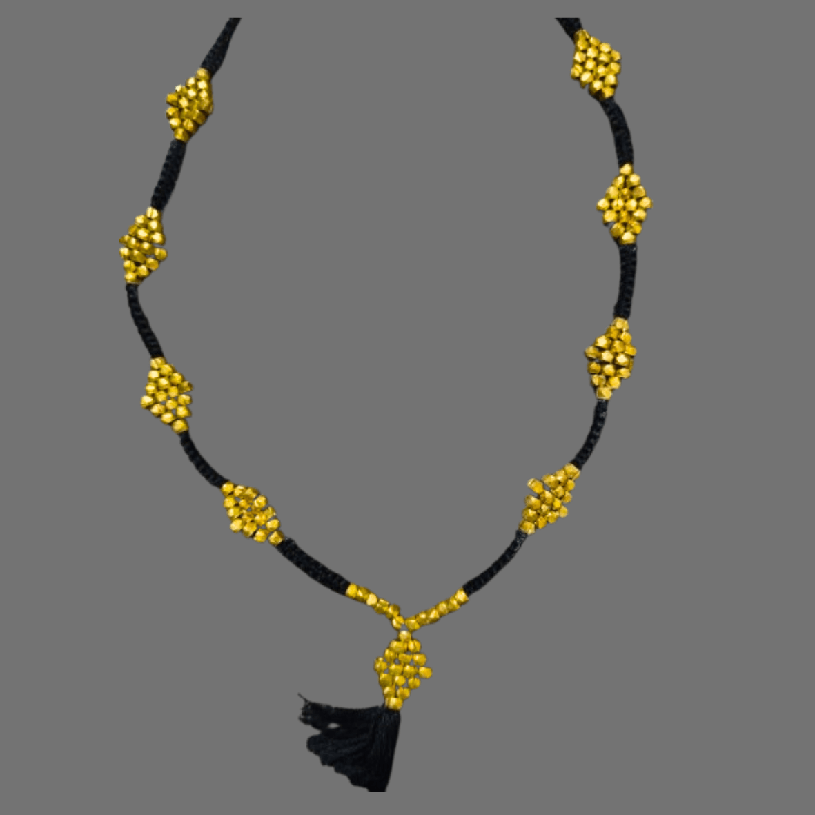 Experience the elegance of tradition with Manjari Haar– Handmade Tribal Necklace & Earring Set, crafted with golden brass beads intricately woven on a black cotton thread. The clustered beadwork symbolizes unity and strength, while the black thread enhances its earthy tribal appeal. Paired with matching earrings, this eco-friendly jewellery set is perfect for festive wear, cultural events, and daily ethnic styling.