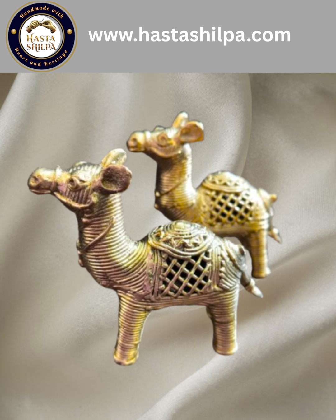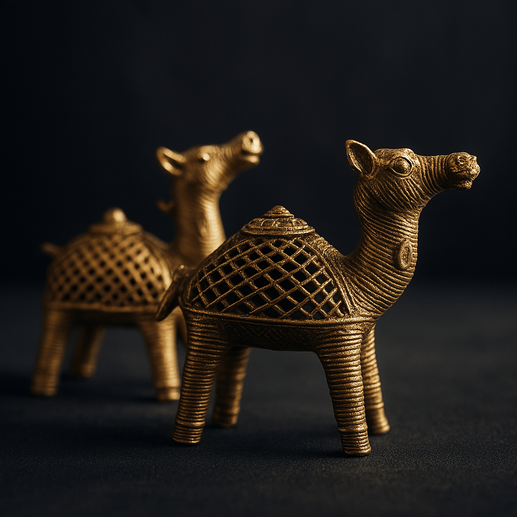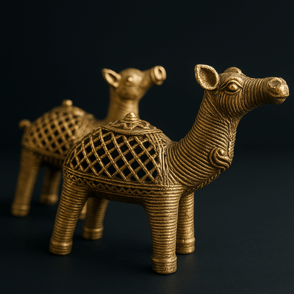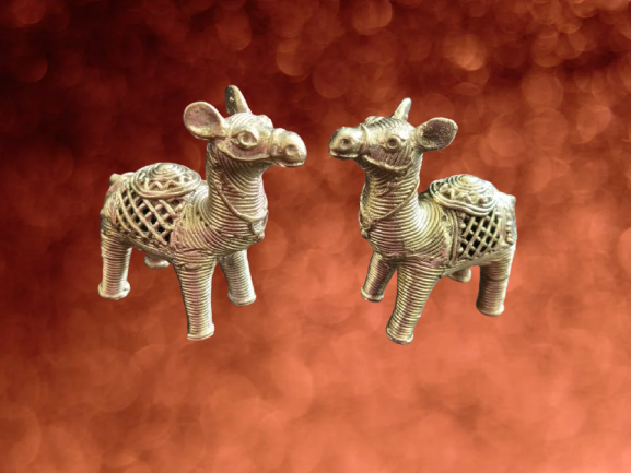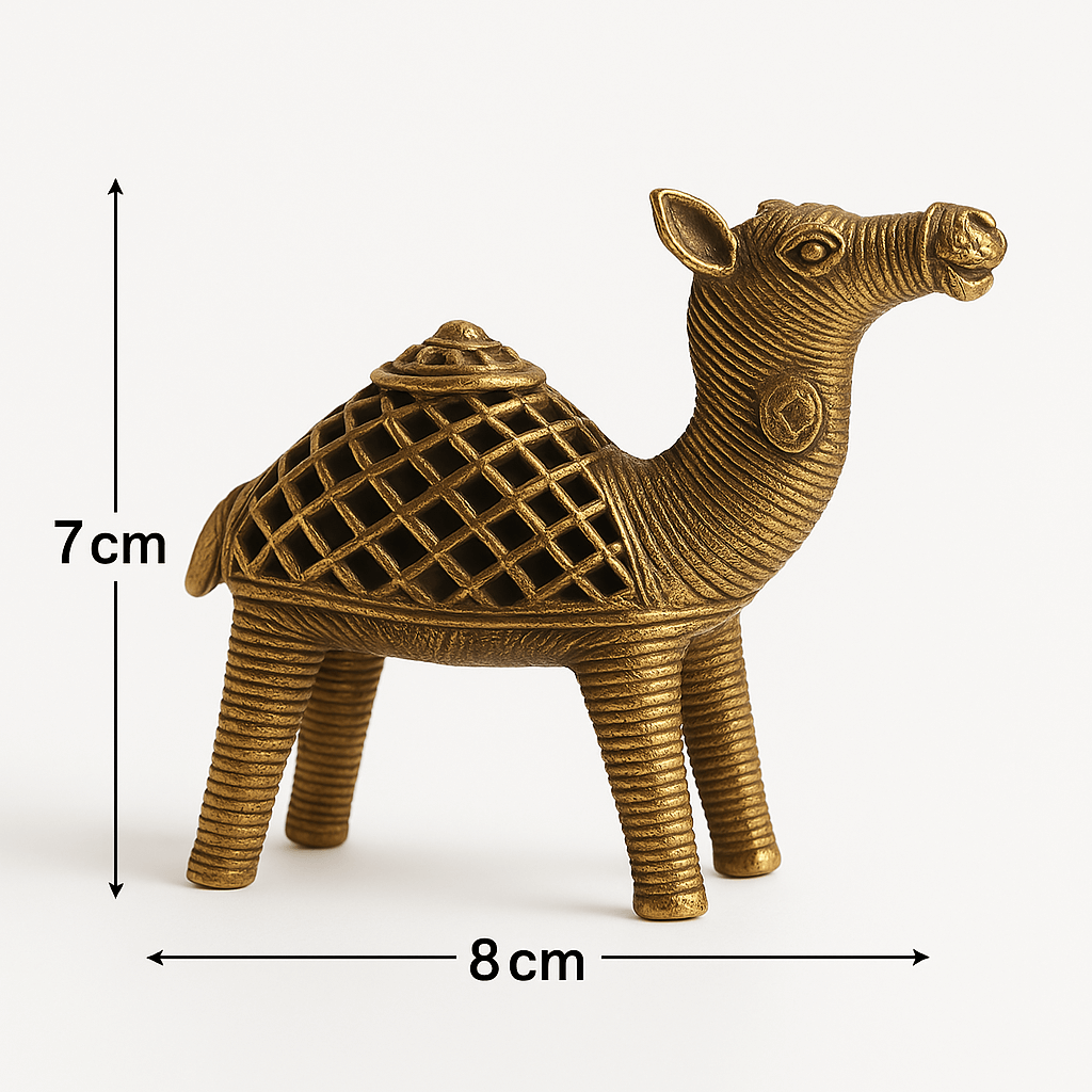 Celebrate the spirit of endurance and artisanal finesse with Maru Sanchari—a radiant brass camel pair handcrafted by skilled metal artisans. With detailed lattice saddle designs and expressive stances, these sculptures echo the quiet nobility of desert journeys and ancient caravans. Whether displayed in a living room vignette or offered as a symbolic gift, this pair lends an air of timeless wanderlust to any space.