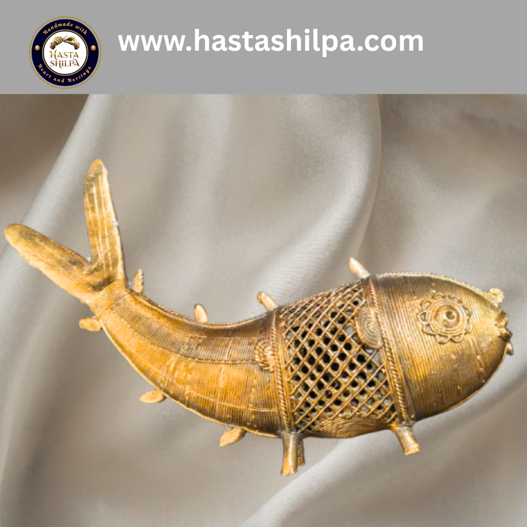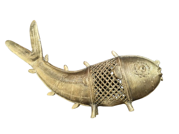 The Matsya Shobha is a magnificent handcrafted Dhokra fish, cast in solid brass using the ancient lost-wax (Dhokra) technique. Its flowing form and intricate patterns reflect both artistic mastery and deep cultural symbolism. Symbolizing abundance, prosperity, and the natural rhythm of life, this piece beautifully bridges tradition with timeless décor. Whether placed in a home, office, or gifted as a token of blessings, the Matsya Shobha brings an aura of elegance and positive energy.