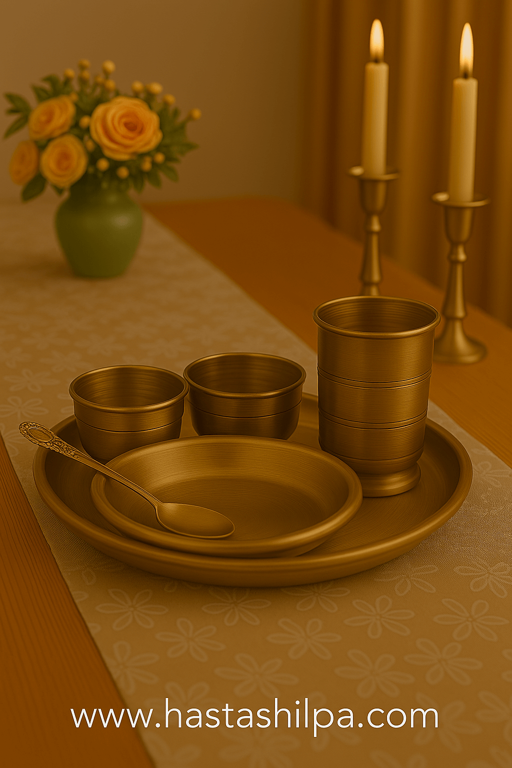 Owning Kansa dining ware is like carrying forward a living tradition – a connection to the wisdom of our ancestors, the artistry of skilled craftsmen, and the timeless beauty of India’s heritage. Its warm golden glow at the dining table is not only a feast for the eyes but also a gentle reminder of our cultural roots.