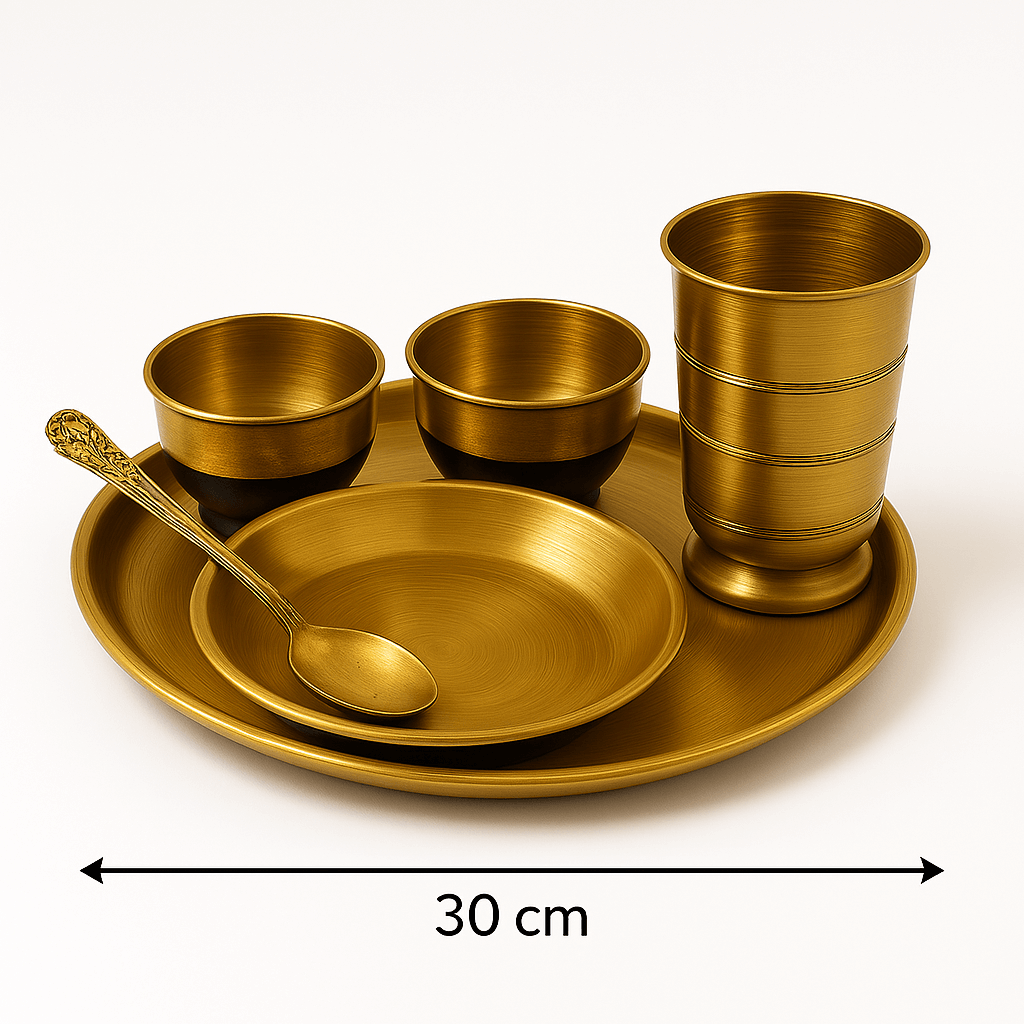 Made from pure bronze (an ancient alloy of copper and tin), Kansa dining ware has been valued in Ayurveda for its ability to enhance digestion, purify food, and balance the body’s energies. The warm golden sheen, smooth finish, and timeless design make this set ideal for festive dining, cultural celebrations, or as an auspicious gift.