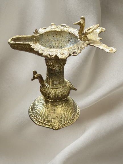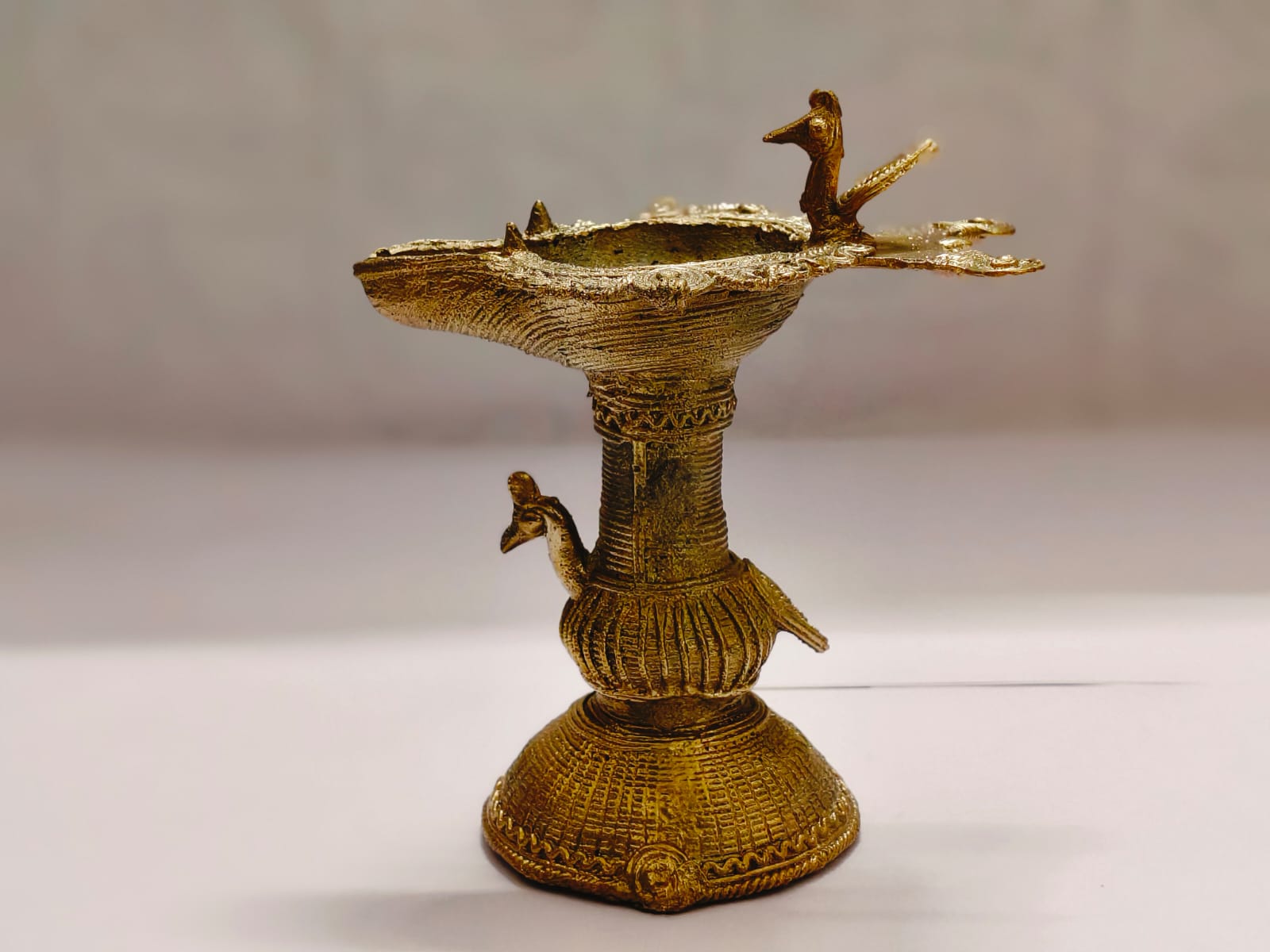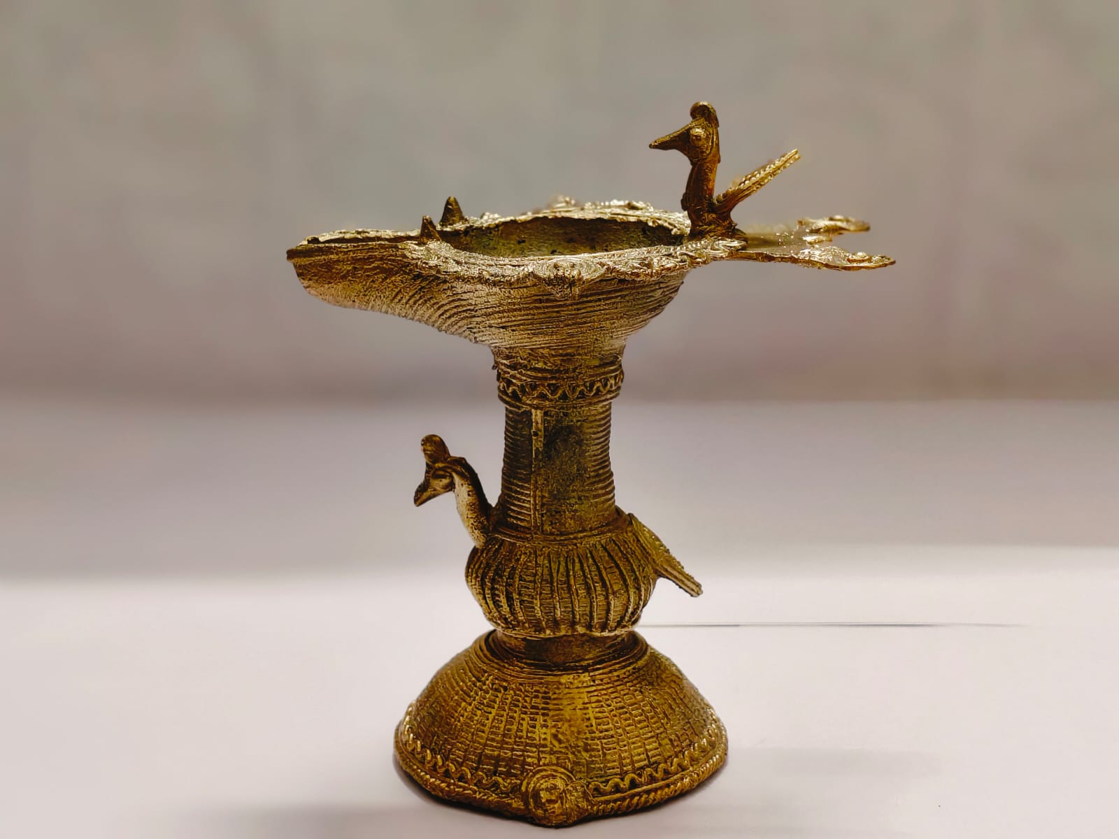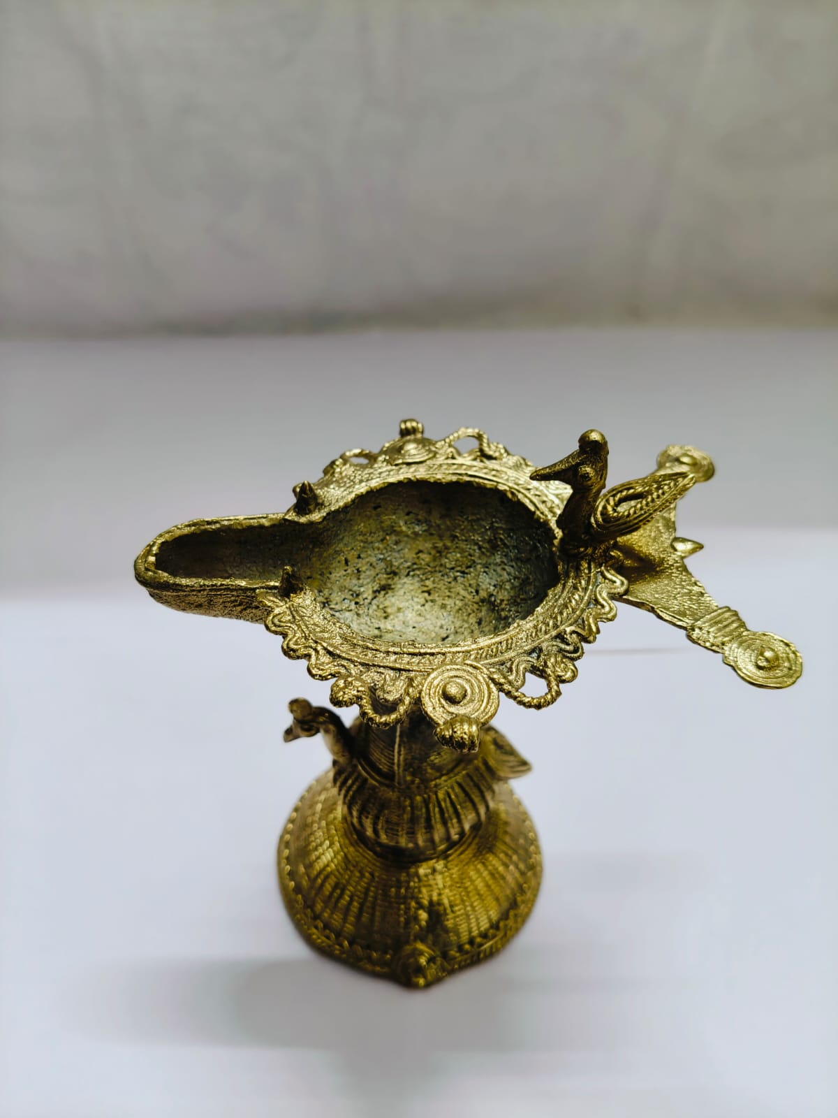 Infuse your spiritual space with luminous heritage through the Vahana Deepam, a handcrafted brass oil lamp alive with artistic symbolism. A poised peacock forms the handle—its feathers etched with ritual flair—while a powerful wing anchors the base, symbolizing protection at the threshold of sacred light. Cast with fine detailing and finished in a vintage patina, this lamp transforms every ritual into a dialogue between story, symbolism, and flame.