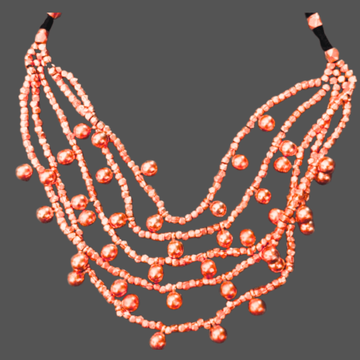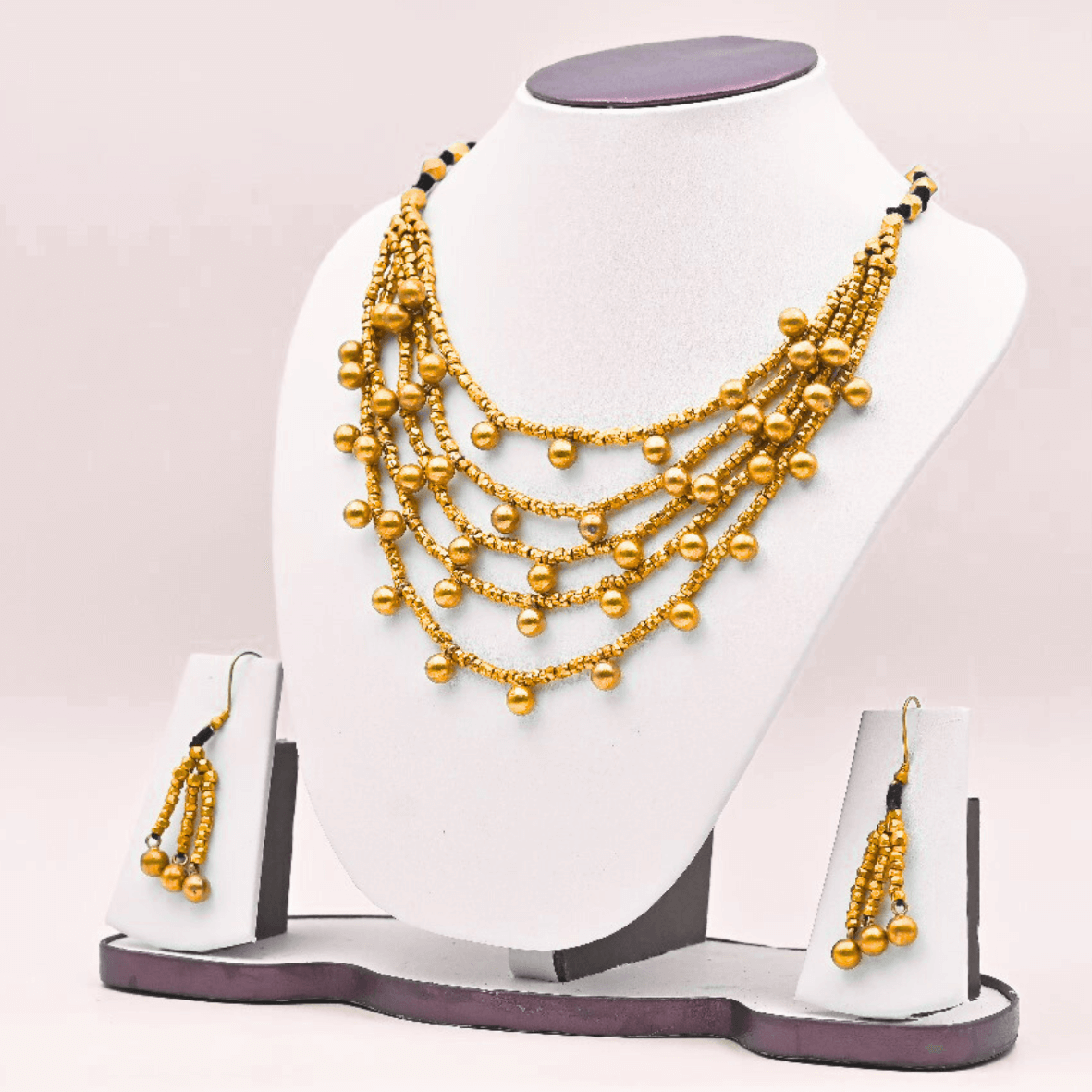 Celebrate the charm of tribal craftsmanship with the Kanaka Mala Brass Necklace Set. This exquisite 20-inch necklace features multiple strands of handcrafted brass beads adorned with spherical accents, creating a layered and festive look. The matching earrings, designed with traditional spiral Dhokra motifs, complete the set beautifully. Lightweight yet striking, this jewellery is ideal for ethnic celebrations, cultural events, or as a bold statement piece in contemporary styling.