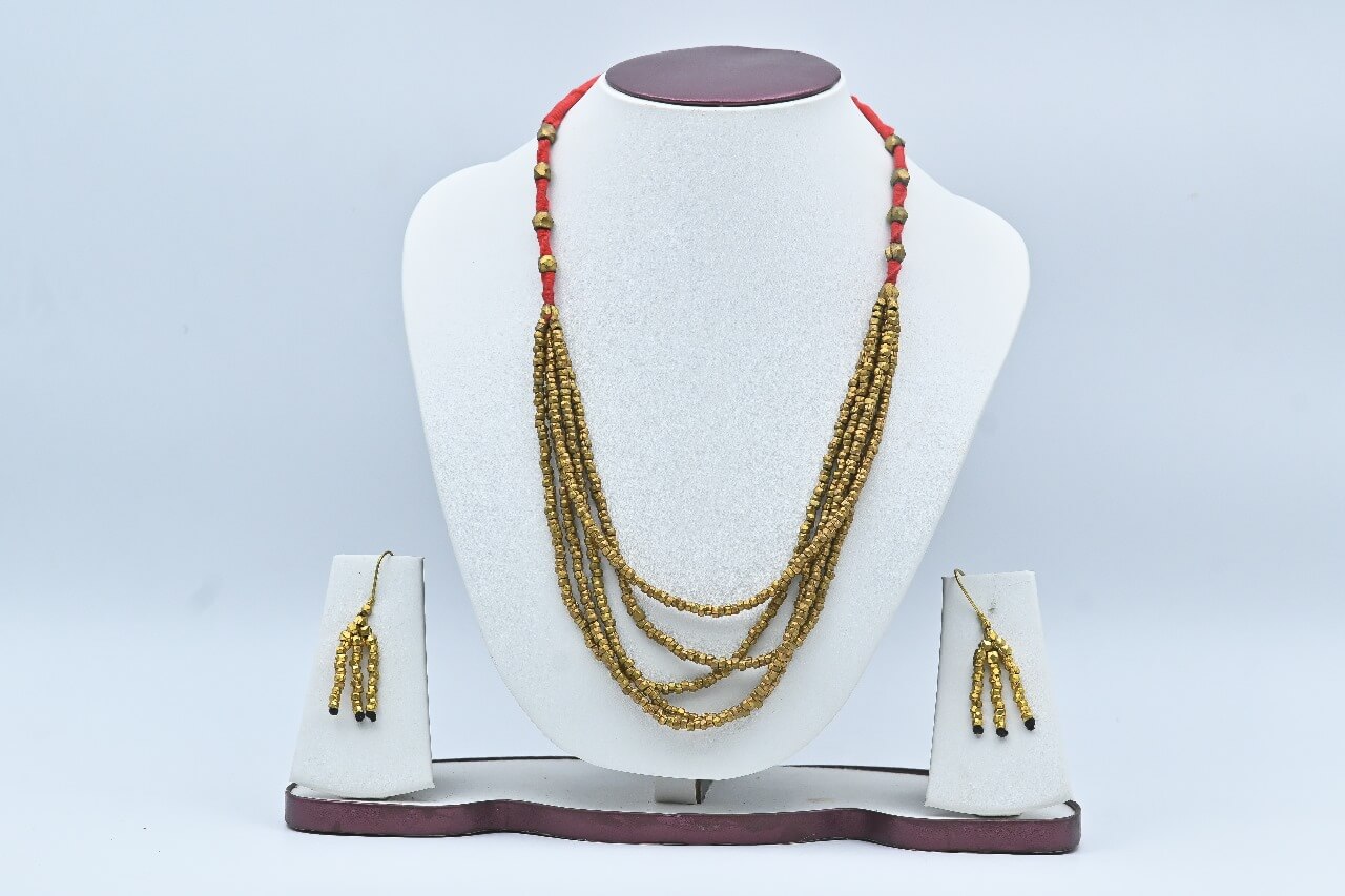 Tribal Elegance – Handmade Dhokra Five-Series Necklace with Angurv Earrings (20″)